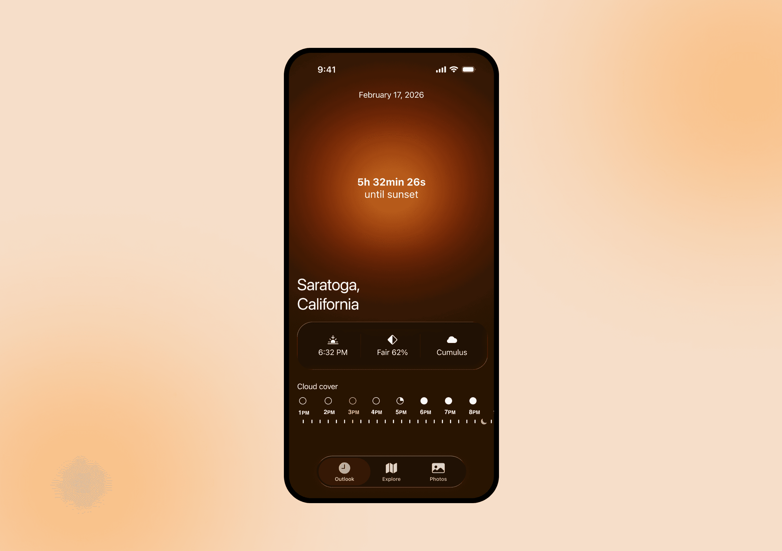 Main page showcasing location, sunset quality shown as percentage, sunset times, countdown, cloud type, and cloud cover.