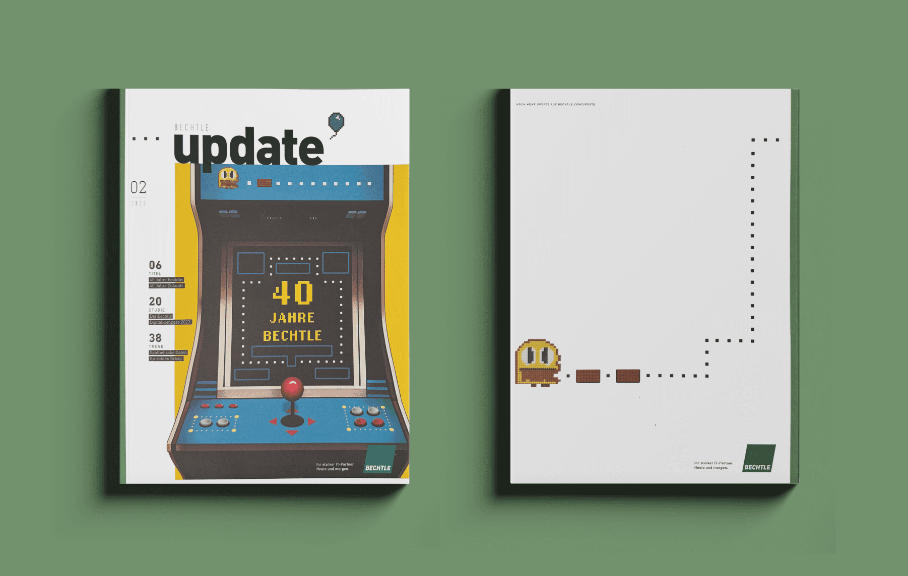 Cover + spreads for Bechtle update reports. Bechtle produces 3 update reports a year, and during my internship I assisted in 2 of them. The first was a special edition for the 40th anniversary of Bechtle, so the theme of the report was to explain Bechtle's story through the different eras of video games. To achieve this, we used MidJourney to create custom assets.
