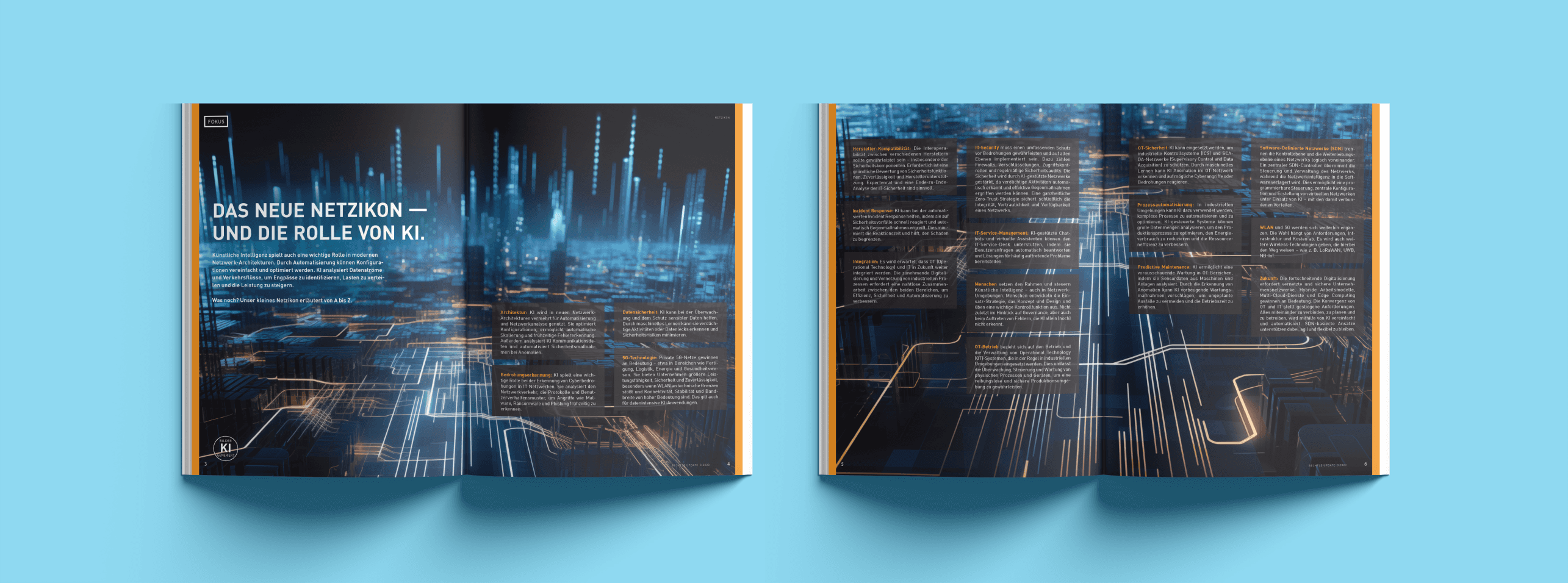 Below are a couple spreads I created for the other report I assisted in. The contents of the spread are an A-Z story of how Artificial Intelligence has a role in modern network architectures. I created the imagery in Midjourney for these spreads.